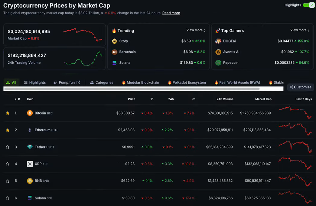 Bitcoin ở thời điểm Paolo chia sẻ trong ngày qua là 88,000 USD. Một số altcoin đã hồi phục nhẹ, nhưng khung tuần hầu hết các đồng đều giảm mạnh. Vốn hóa thị trường crypto là 3.02 nghìn tỷ USD.