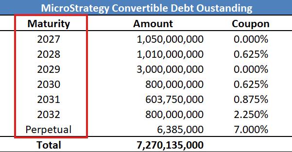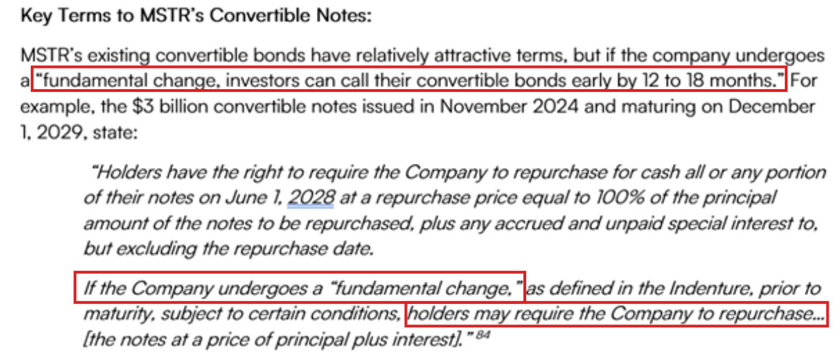 Lo lắng về khả năng MicroStrategy bị thanh lý không phải là không có, nhưng xác suất xảy ra là rất thấp. MicroStrategy đã sống sót qua nhiều đợt Bitcoin giảm giá, bao gồm cả cú sập năm 2022 khi Bitcoin giảm từ khoảng 69.000 USD xuống còn 15.000 USD. Công ty có tổng nợ khoảng 8,2 tỷ USD, phần lớn trong số đó là các khoản trái phiếu chuyển đổi chưa đến hạn cho đến năm 2028 và % lãi suất là 0% hoặc rất thấp. Để bị thanh lý bắt buộc, công ty phải trải qua một “thay đổi cơ bản”, chẳng hạn như từ bỏ chiến lược thu mua BTC, được cổ đông chấp thuận giải thể, hoặc rơi vào tình trạng phá sản.