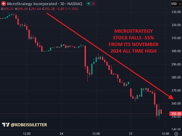 Cổ phiếu MicroStrategy đã giảm hơn 55%, làm dấy lên lo ngại về khả năng bị thanh lý số Bitcoin mà công ty đang nắm giữ. Hiện tại, MicroStrategy sở hữu khoảng 499.096 BTC trị giá 43,7 tỷ USD, với mức giá trung bình mua mỗi Bitcoin là 66.350 USD.