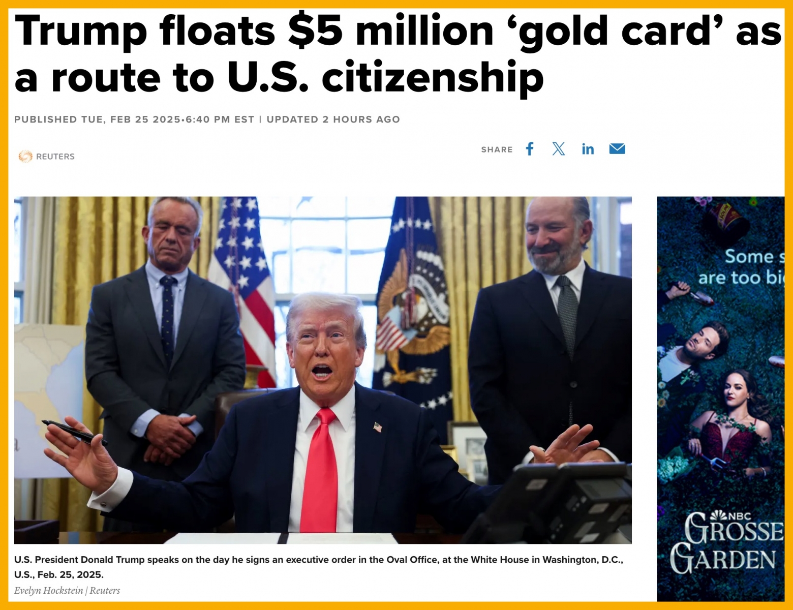 Bên cạnh đó, tổng thống Trump đề xuất khởi động chương trình bán Trump Gold Cards với giá 5 triệu USD cho người nước ngoài muốn có visa nhập cư vào Mỹ. Tuy nhiên, họ vẫn cần đầu tư và tạo việc làm cho người Mỹ.