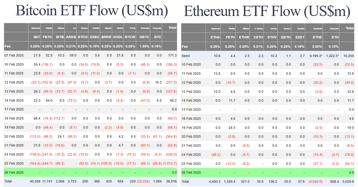 BTC được coi như các cổ phiếu công nghệ nên khi chứng khoán giảm thì chúng ta cũng thấy lực bán ở quỹ BTC và ETH ETF. Các quỹ BTC spot ETF ở Hoa Kỳ tiếp tục có dòng tiền rời khỏi ở hầu hết các quỹ, với tổng số tiền ra là 1,012 triệu USD. Còn ETH spot ETF cũng có dòng tiền vào âm 50 triệu USD.
