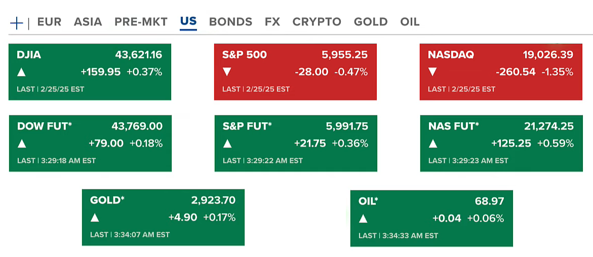 Chứng khoán Hoa Kỳ thứ ba (25/02) vẫn có sự phân hóa với Dow Jones tăng 0.37%, hai chỉ số còn lại đều giảm. Hợp đồng tương lai của chứng khoán tăng nhẹ. Hợp đồng dầu và vàng vẫn tăng lên 68.9 USD/thùng và 2923 USD/ounce, không thay đổi nhiều so với ngày trước đó.