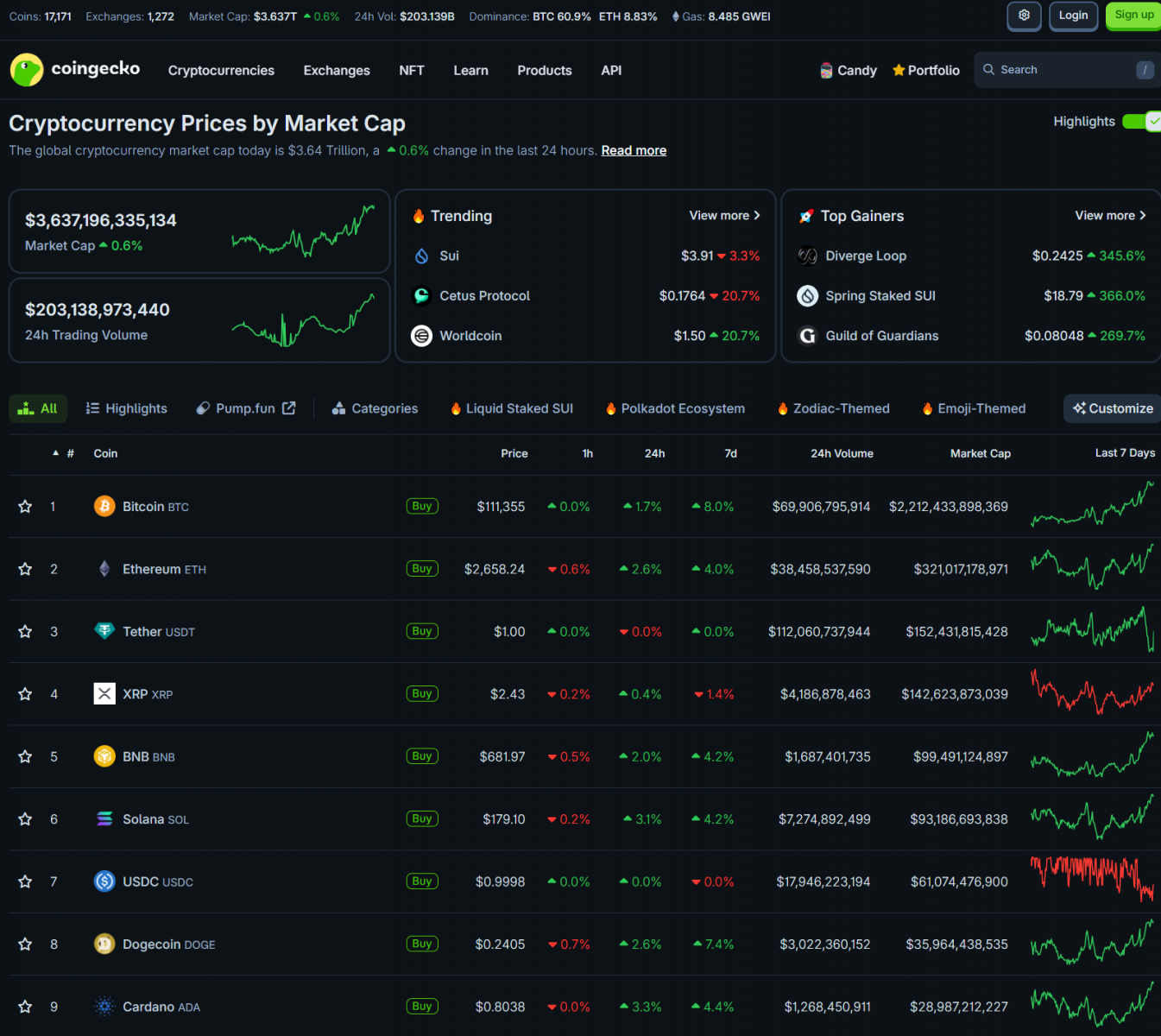 Còn crypto lại có xu hướng ngược lại với chứng khoán. Trong đó, Bitcoin đã tăng vượt đỉnh cũ và đạt đỉnh mới trên 111,000 USD. Hầu hết altcoin đều tăng trong phiên. Vốn hóa thị trường crypto cũng tăng lên 3.637 nghìn tỷ USD.