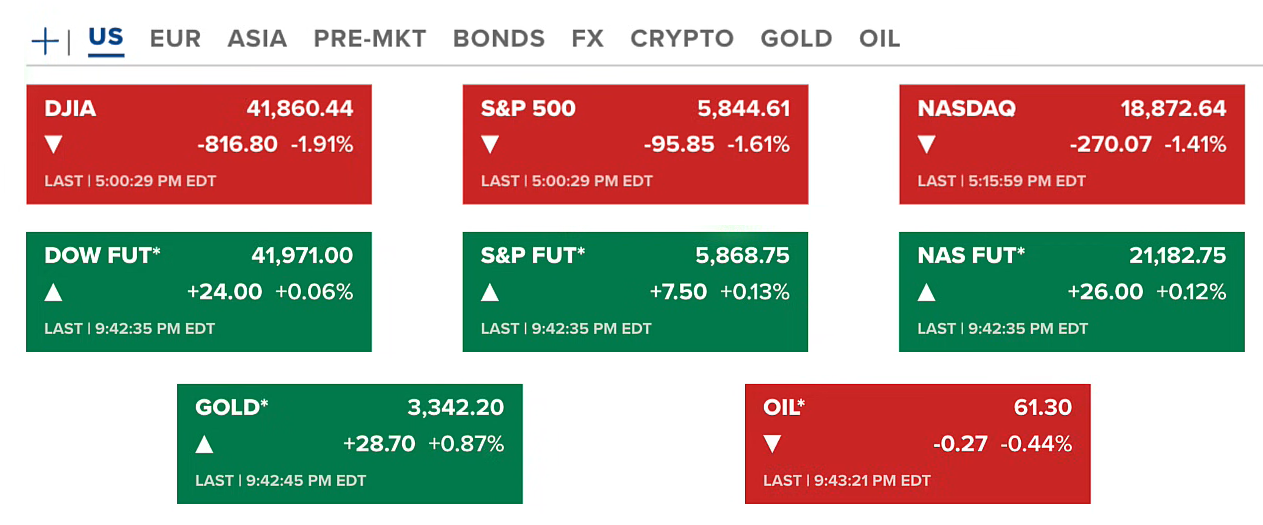 Chứng khoán Hoa Kỳ đã giảm ở cả ba chỉ số với mức giảm trên 1.4%, Dow Jones giảm nhiều nhất 1.91%. Hợp đồng tương lai của chứng khoán tăng nhẹ. Vàng tiếp tục tăng lên 3342 USD/ounce. Dầu ở mức 61 USD/thùng.