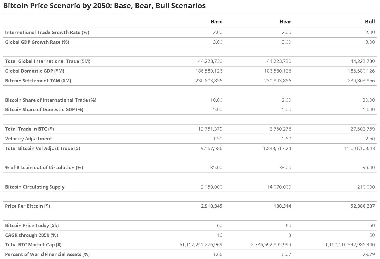 Theo kỳ vọng, giá Bitcoin có thể đạt 2.9 triệu USD mỗi BTC vào năm 2050. Trong trường hợp bi quan, giá có thể là 130,000 USD mỗi BTC vào thời điểm đó. Còn trong trường hợp lạc quan, giá có thể lên đến 52 triệu USD mỗi BTC.