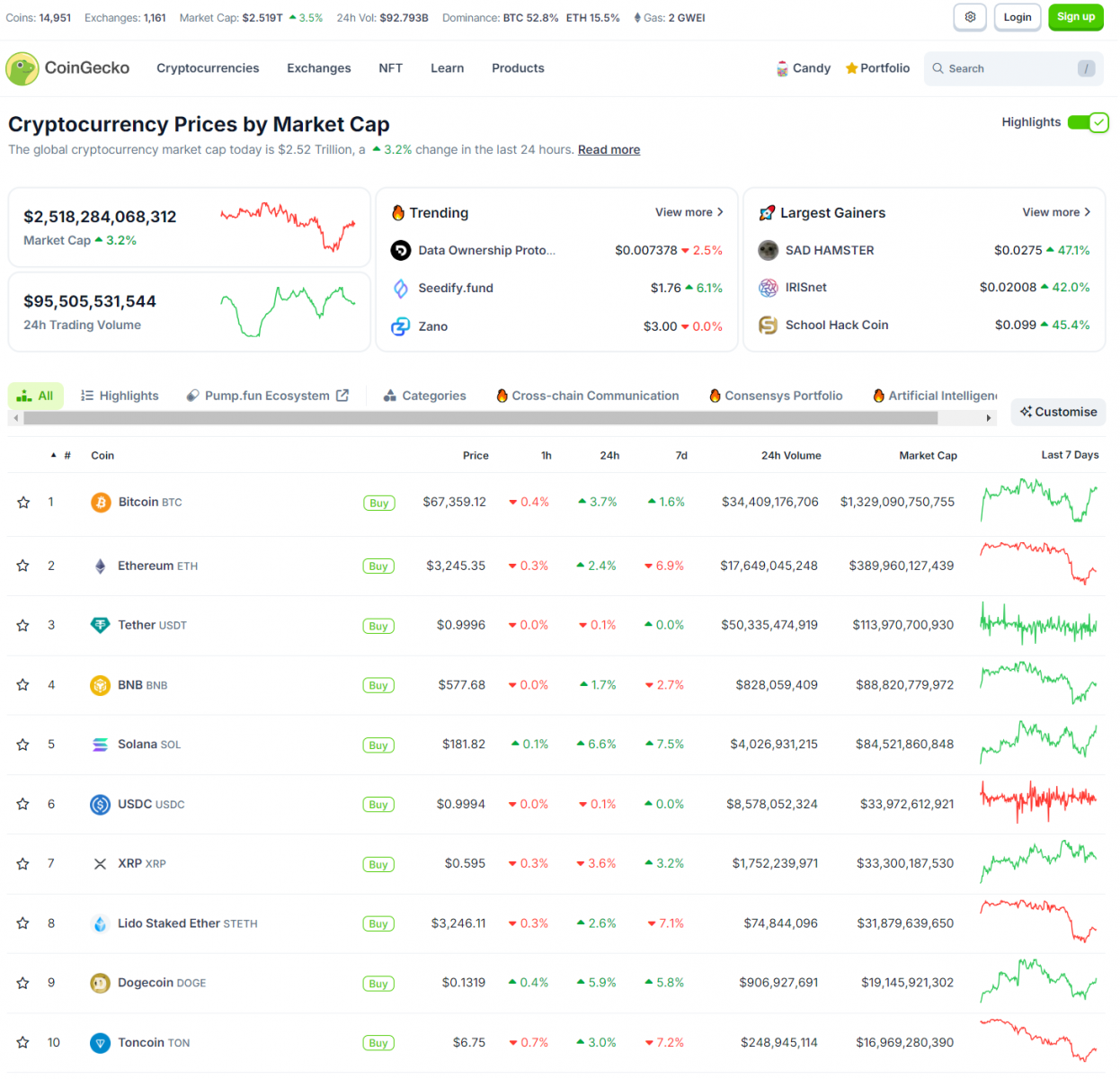 Về crypto, Bitcoin hồi phục tốt lên 65,000 USD và có thời điểm đã trên 67,000 USD. Đa số các altcoin lớn đều tăng trưởng. Vốn hóa thị trường crypto là 2.518 nghìn tỷ USD.