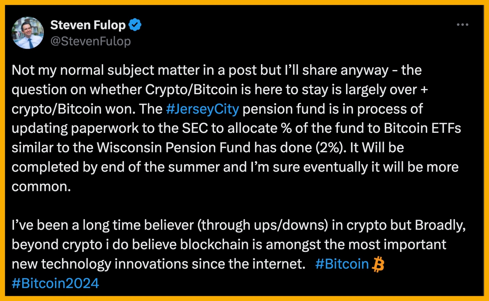 Ông Steven Fulop đã tuyên bố rằng câu hỏi liệu Bitcoin hay crypto có tồn tại lâu dài hay không đã đến hồi kết và Bitcoin/crypto đã chiến thắng.