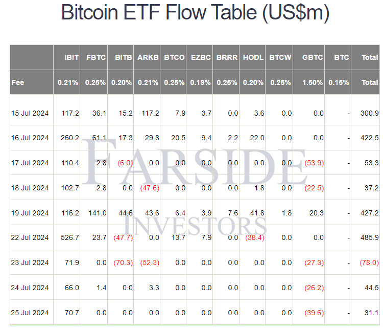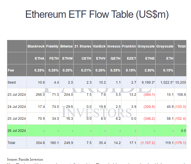 ETH spot ETF đã có phiên thứ năm (25/07) với dòng tiền vào âm 152 triệu USD. Dòng tiền rời khỏi quỹ ETHE của Grayscale, còn ETHA có dòng tiền vào dương 70.9 triệu USD.