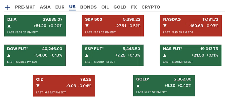 Kết thúc thứ năm (25/07), chứng khoán Hoa Kỳ tiếp tục giảm ở hai chỉ số S&P 500 và Nasdaq, còn Dow Jones đã tăng nhẹ 0.2%. Hợp đồng tương lai của chứng khoán đã xanh trở lại. Vàng và dầu ở quanh mức 2362 USD/ounce và 78 USD/thùng.