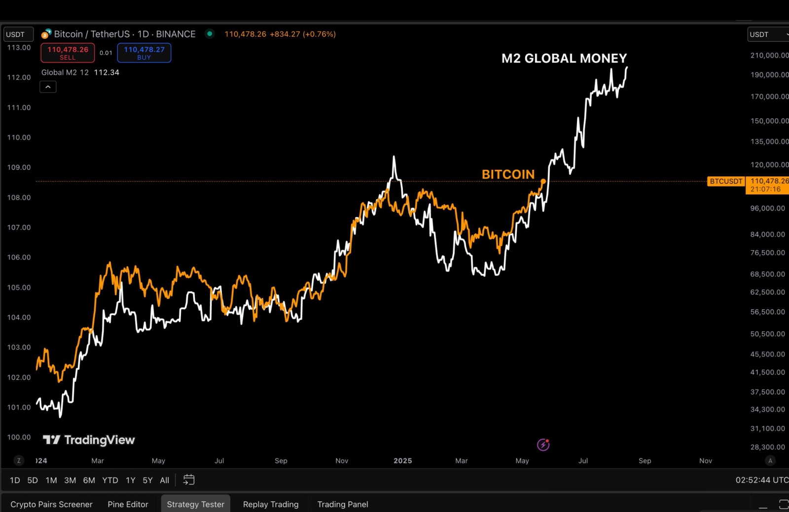 Gần đây, chúng ta thấy BTC có tương quan dương với sự tăng trưởng của nguồn cung tiền M2 toàn cầu.