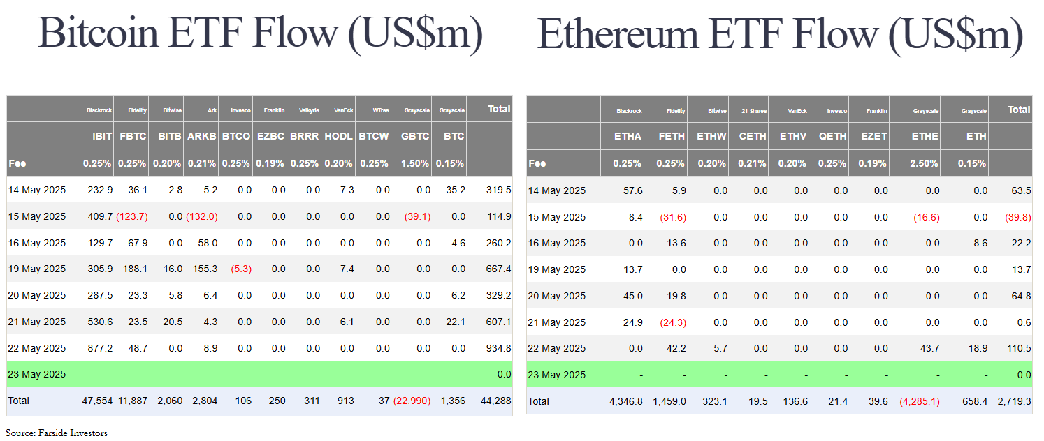 Các quỹ BTC spot ETF Hoa Kỳ thứ năm tiếp tục có dòng tiền vào dương lớn, với tổng 934.8 triệu USD. ETH spot ETF cũng có dòng tiền vào lớn với 110.5 triệu USD. Đây là phiên có dòng tiền vào rất lớn cho cả hai quỹ trong tuần qua.
