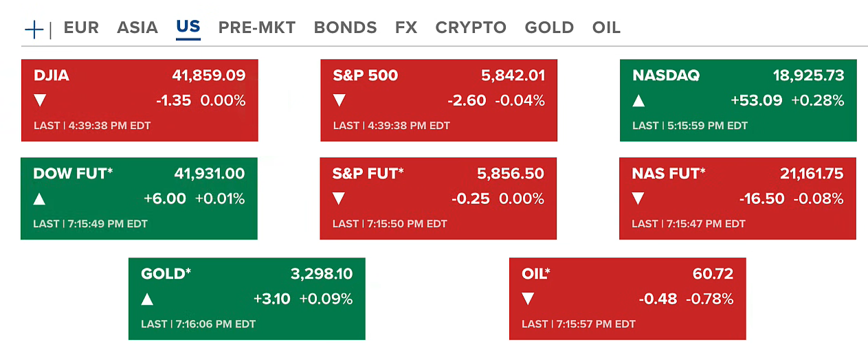 Chứng khoán Hoa Kỳ thứ năm (22/05-US) kết thúc với hai chỉ số Dow Jones và S&P 500 gần như đi ngang, còn Nasdaq tăng nhẹ 0.28%. Hợp đồng tương lai của chứng khoán không thay đổi nhiều nhưng đa số nghiêng về xu hướng giảm. Vàng vẫn ở mức cao 3298 USD/ounce. Dầu giảm về 60.72 USD/thùng.