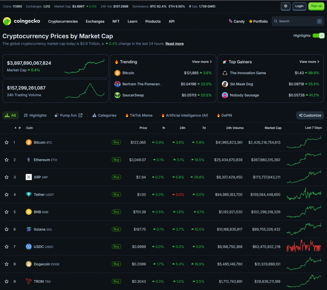 Thị trường crypto đã sôi động trở lại khi Bitcoin đã tiếp tục đạt đỉnh mới lên 119,000 USD rồi lên 122,000 USD. Hầu hết altcoin đều tăng. Vốn hóa thị trường crypto tăng lên 3.89 nghìn tỷ USD.