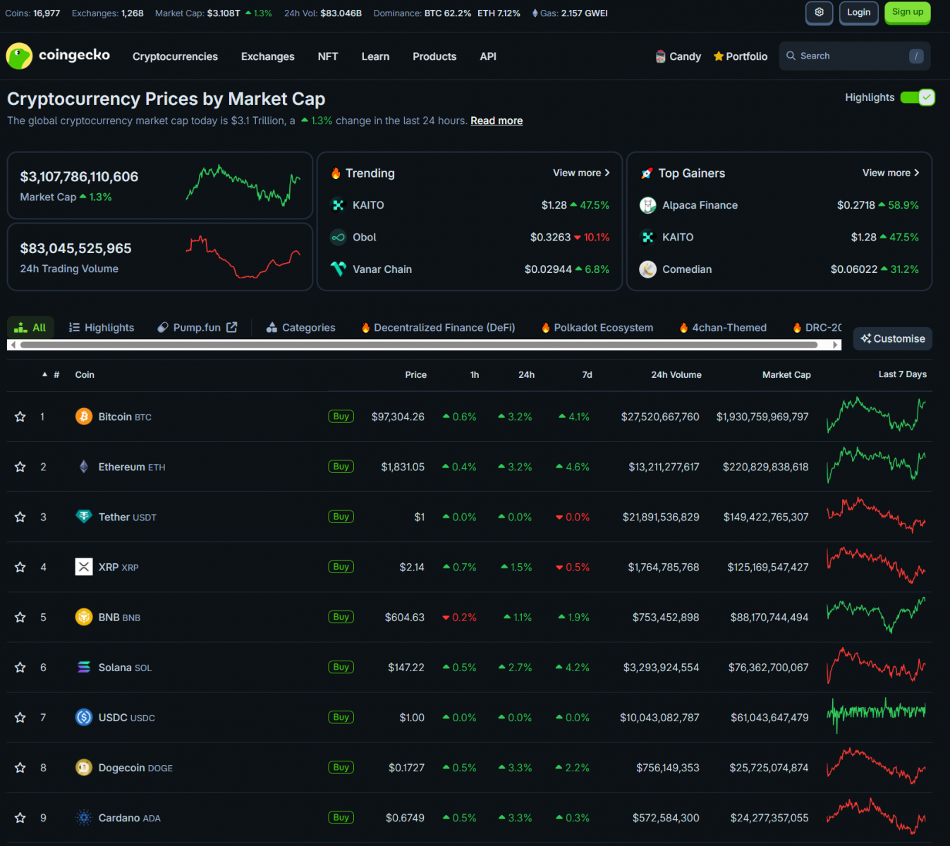 Bitcoin đã tăng lên 97,000 USD. Hầu hết altcoin lớn đều tăng trưởng nhưng BTC vẫn dẫn đầu về mức tăng. Vốn hóa thị trường crypto tăng lên 3.107 nghìn tỷ USD.