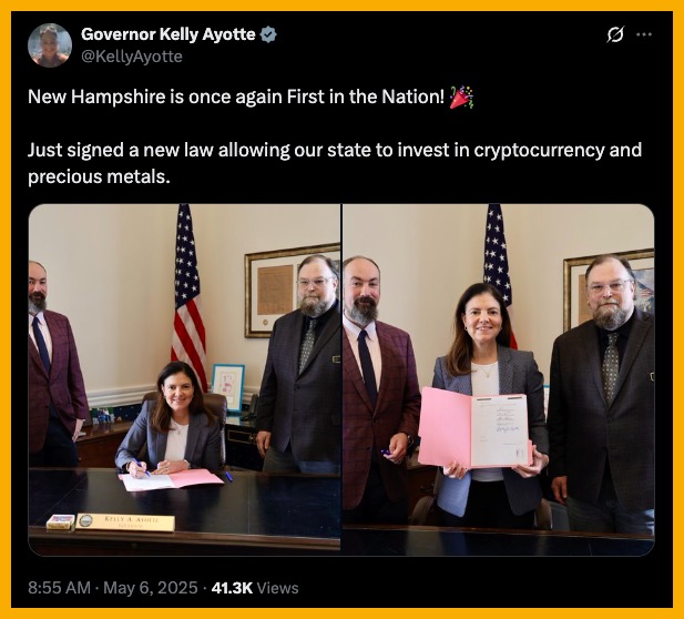 Tiểu bang New Hampshire bất ngờ trở thành tiểu bang đầu tiên của Hoa Kỳ cho phép thủ quỹ của bang đầu tư quỹ công vào Bitcoin và các tài sản số khác, sau khi Thống đốc Kelly Ayotte ký ban hành Dự luật HB302.