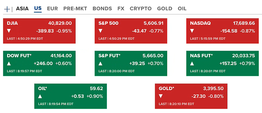 Chứng khoán Hoa Kỳ kết thúc thứ tư (06/05) với sự điều chỉnh ở cả ba chỉ số, trong đó Dow Jones giảm nhiều nhất 0.95%. Thị trường hợp đồng tương lai của chứng khoán cũng giảm nhẹ. Hợp đồng vàng ở mức cao 3395 USD/ounce. Dầu tăng nhẹ lên 59.6 USD/thùng.