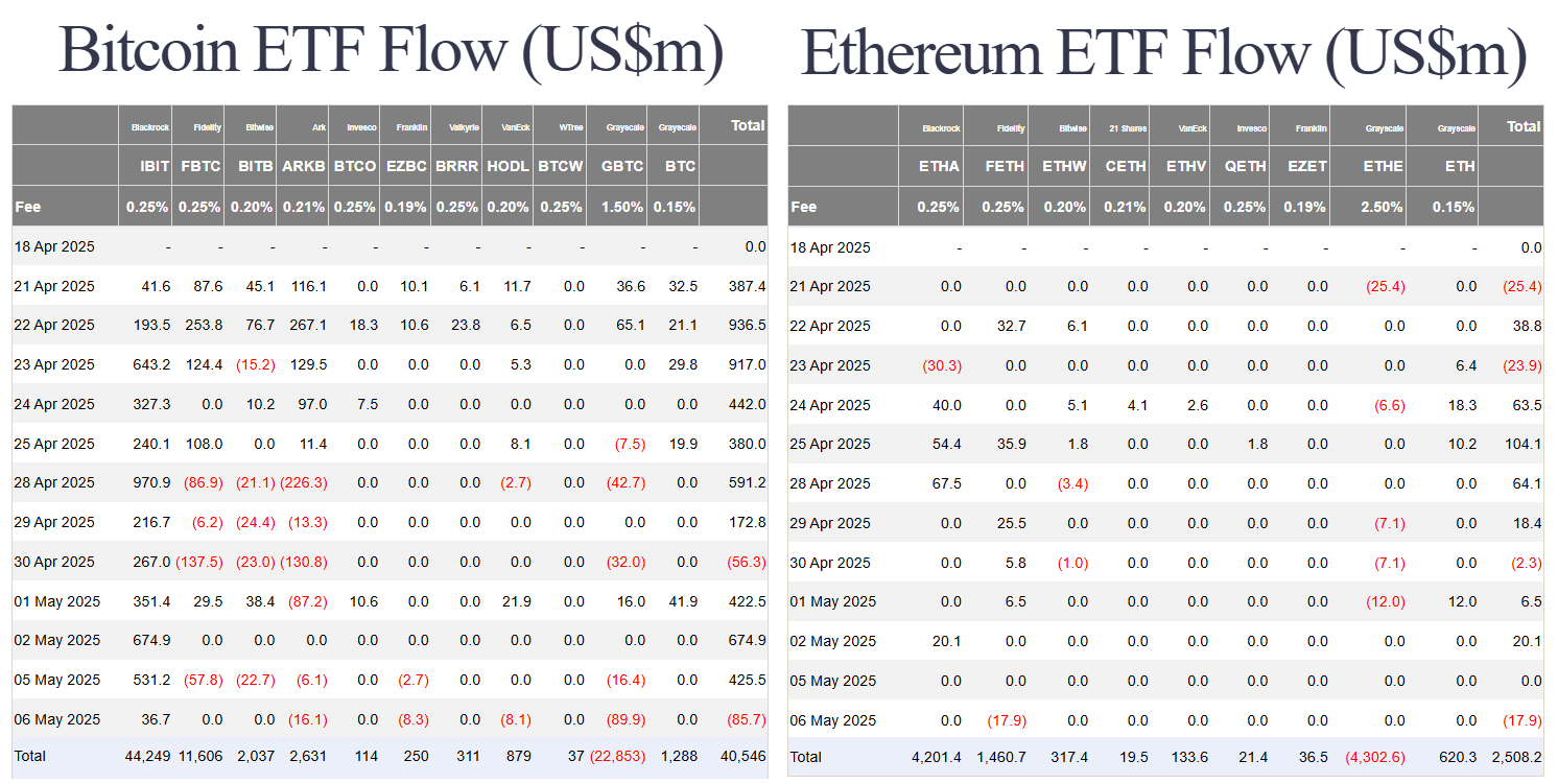 Các quỹ BTC spot ETF đã có phiên giao dịch thứ tư (06/05) với dòng tiền vào âm 85.7 triệu USD. Tương tự, ETH spot ETF cũng có dòng tiền vào âm 17.9 triệu USD.