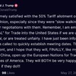 Liên quan đến mức thuế 50% mà ông đề cập tới cho Liên minh châu Âu, Tổng thống Trump cho biết phía EU đã phản hồi và hiện đang tìm cách nhanh chóng sắp xếp các cuộc họp. Ông coi đây là một tín hiệu tích cực và kêu gọi EU đi theo con đường giống như Trung Quốc, mở cửa thị trường để giao thương với Hoa Kỳ, đồng thời dự đoán rằng cả hai bên sẽ cùng thành công nếu hợp tác.