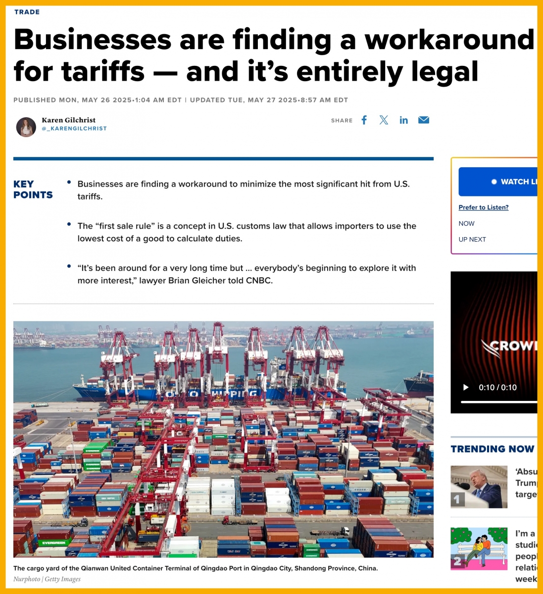 CNBC mới đây đã đưa tin về doanh nghiệp lách thuế nhập khẩu bằng “Chiêu Cũ Mà Hiệu Quả”. Trước làn sóng áp thuế từ chính quyền Tổng thống Trump, nhiều doanh nghiệp đang âm thầm áp dụng lại một “chiêu” cũ mang tên “quy tắc bán hàng đầu tiên” (first sale rule) — một kẽ hở hợp pháp trong luật hải quan Mỹ để giảm bớt gánh nặng chi phí nhập khẩu.