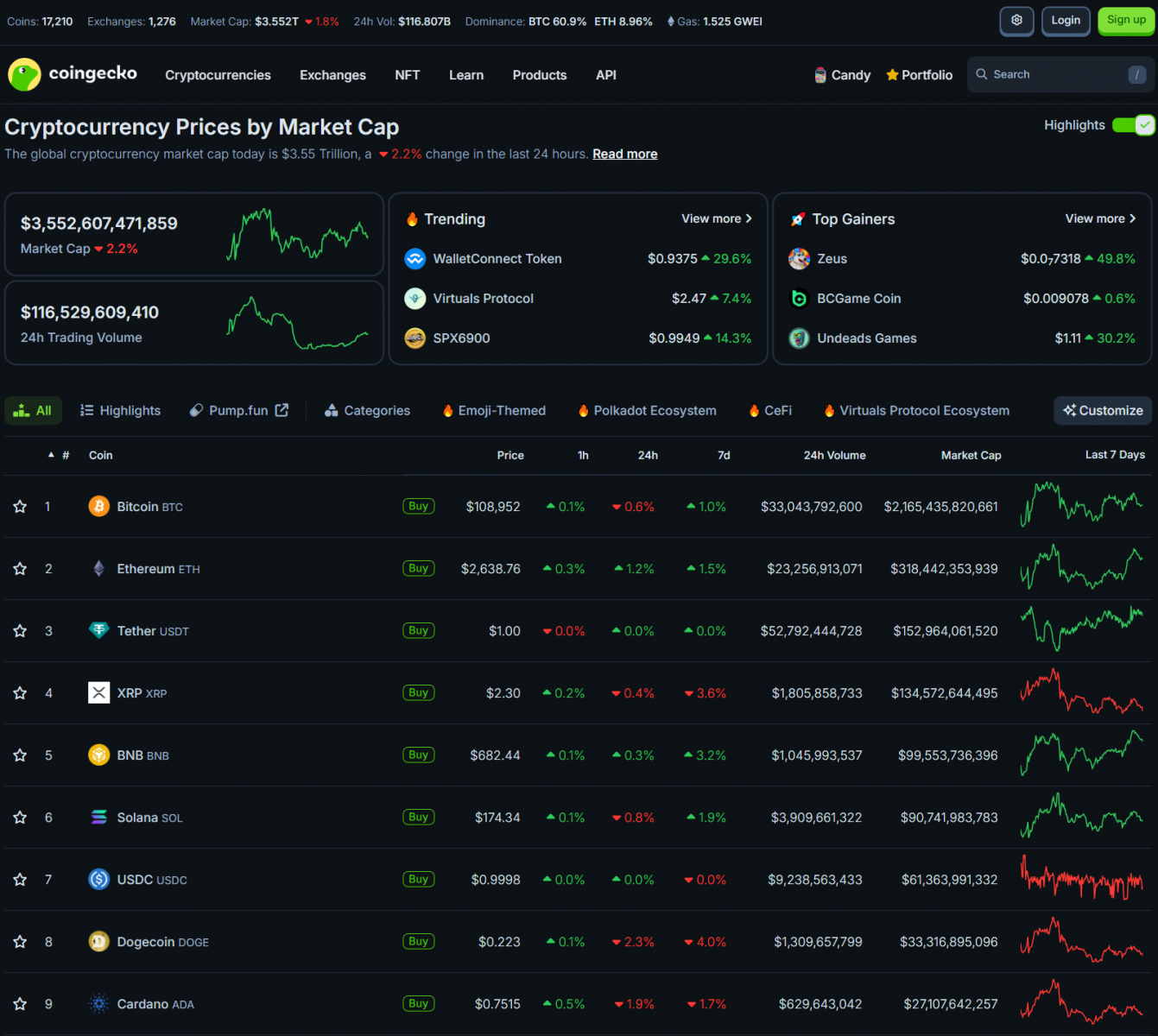 Bitcoin không thay đổi nhiều về giá, vẫn quanh 108,000 USD – 109,000 USD. Các altcoin lớn có sự phân hóa, một số tăng, một số khác lại giảm. Vốn hóa thị trường crypto là 3.552 nghìn tỷ USD.