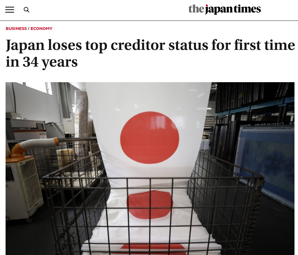 Lần đầu tiên sau 34 năm, Nhật Bản không còn là quốc gia cho vay nhiều nhất thế giới. Vị trí này hiện thuộc về Đức. Dù Nhật vẫn có lượng tài sản ở nước ngoài cao kỷ lục, Đức đã vượt lên nhờ xuất khẩu mạnh và kiếm được nhiều tiền từ thế giới hơn là chi ra. Ngoài ra, đồng euro tăng giá so với đồng yên cũng khiến tài sản của Đức tính theo yên nhiều hơn.