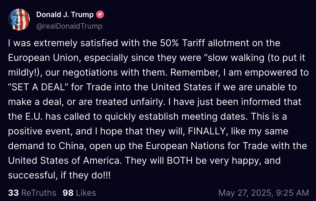 Liên quan đến mức thuế 50% mà ông đề cập tới cho Liên minh châu Âu, Tổng thống Trump cho biết phía EU đã phản hồi và hiện đang tìm cách nhanh chóng sắp xếp các cuộc họp. Ông coi đây là một tín hiệu tích cực và kêu gọi EU đi theo con đường giống như Trung Quốc, mở cửa thị trường để giao thương với Hoa Kỳ, đồng thời dự đoán rằng cả hai bên sẽ cùng thành công nếu hợp tác.