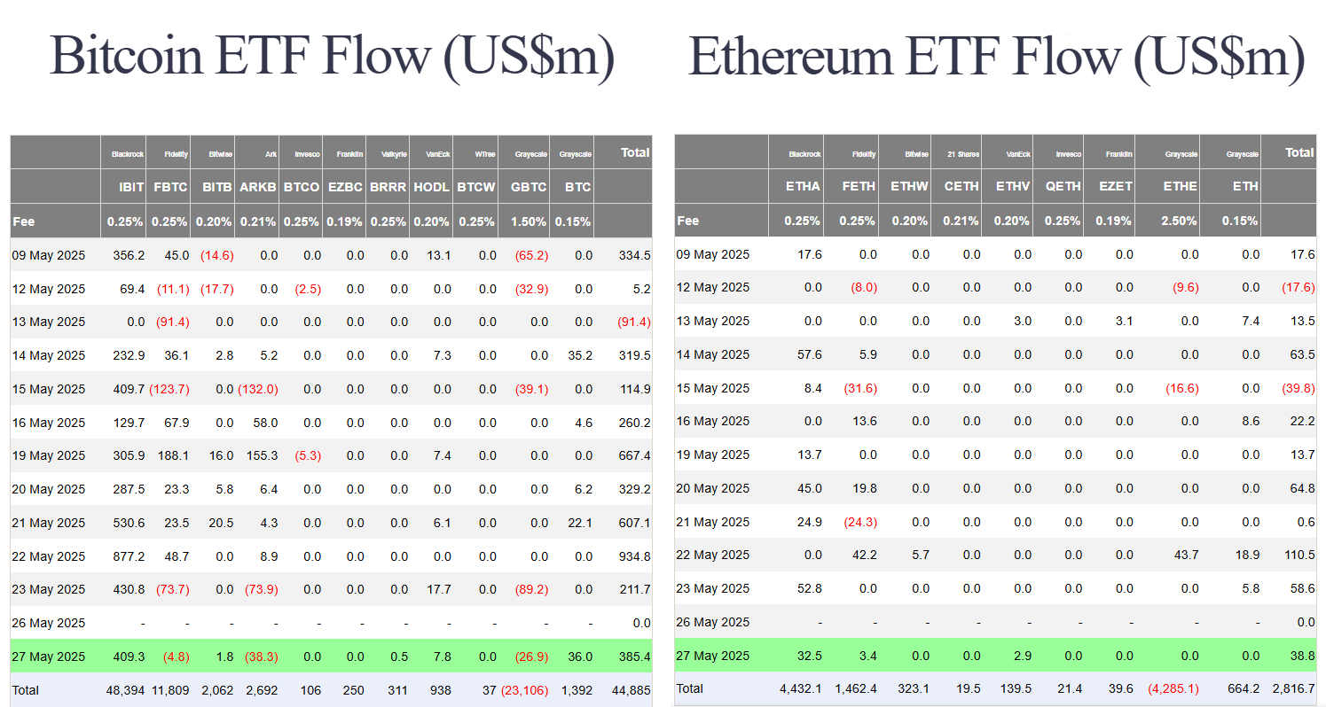 Các quỹ BTC spot ETF Hoa kỳ thứ ba tiếp tục có dòng tiền vào dương 385.4 triệu USD ở tổng các quỹ. Tuy nhiên, vẫn có một số quỹ có dòng tiền rời khỏi như FBTC, ARKB, GBTC, và dòng tiền vào chủ yếu quỹ IBIT. Tương tự, ETH spot ETF cũng có dòng tiền vào dương 38.8 triệu USD.