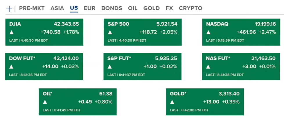 Chứng khoán Hoa Kỳ thứ ba (27/05) kết thúc phiên cả ba chỉ số đều tăng đáng kể, với Nasdaq tăng nhiều nhất 2.47%. Hợp đồng tương lai của chứng khoán cũng tiếp tục xu hướng tăng. Vàng và dầu đều tăng lên lần lượt là 3313 USD/ounce và 61.38 USD/thùng.