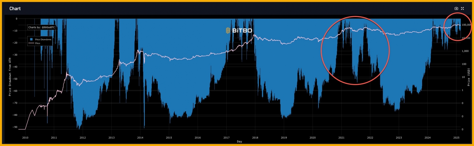 Đợt giảm giá này của BTC chỉ giảm khoảng hơn 20% so với mức giá cao gần nhất 109,000 USD. Trong lịch sử, BTC đã từng chứng kiến những đợt giảm đến 40% trong mùa tăng trưởng. Do đó, đợt điều chỉnh này chưa phải đợt giảm lớn.