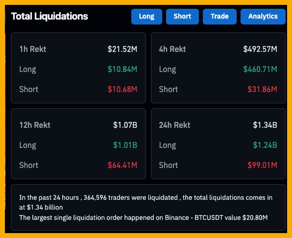 Một trong những lý do khiến giá BTC giảm mạnh và nhanh là bởi hàng loạt lệnh đòn bẩy bị thanh lý. Dữ liệu của Coinglass cho thấy, hơn 1.3 tỷ USD lệnh đòn bẩy bị thanh lý (364,675 traders) trong vòng 24 giờ quanh thời điểm giá giảm.