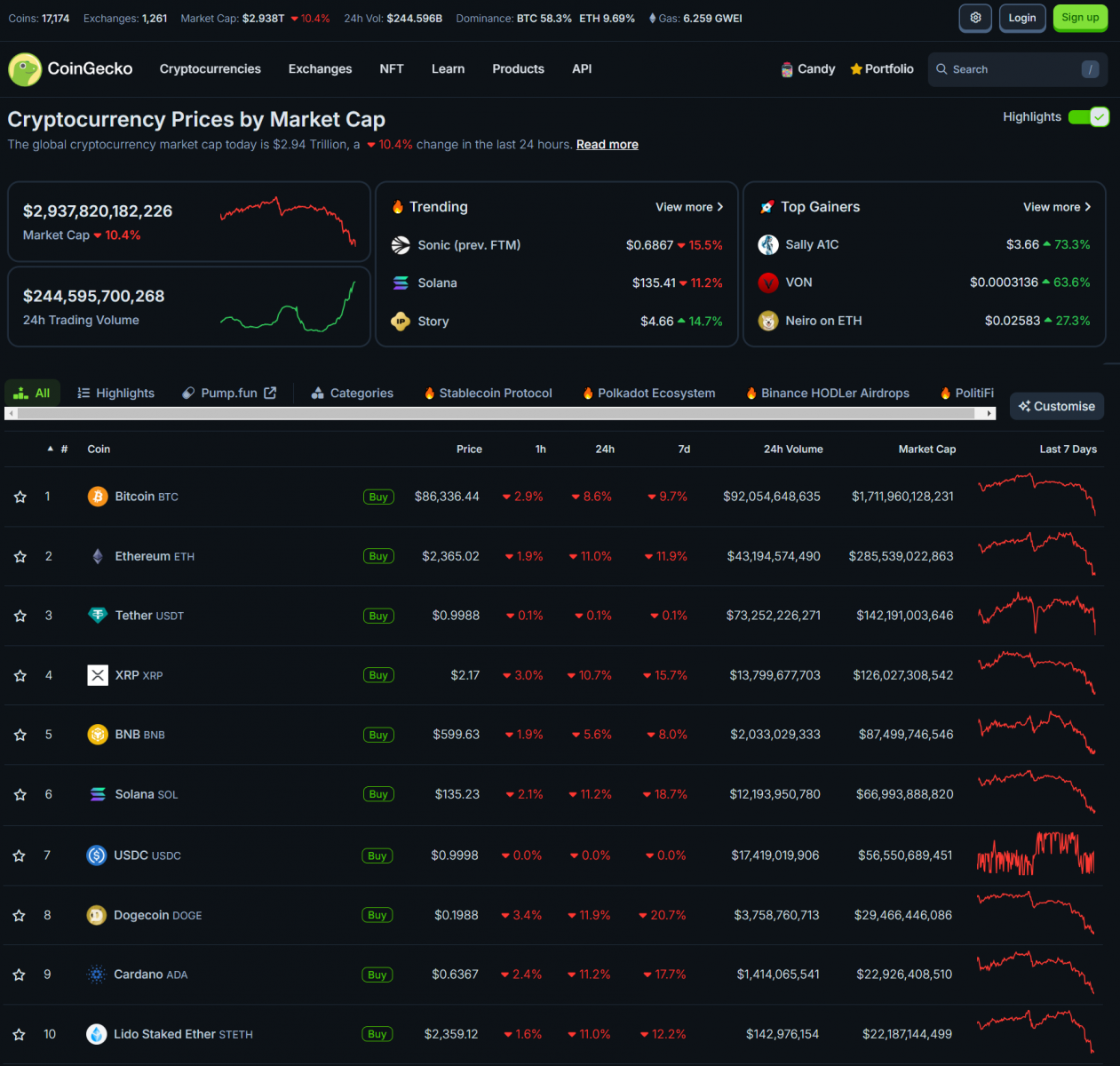 Bitcoin cũng đã giảm mạnh về 86,000 USD. Tất cả các altcoin lớn đều giảm đáng kể. Vốn hóa thị trường crypto giảm xuống 2.937 nghìn tỷ USD.