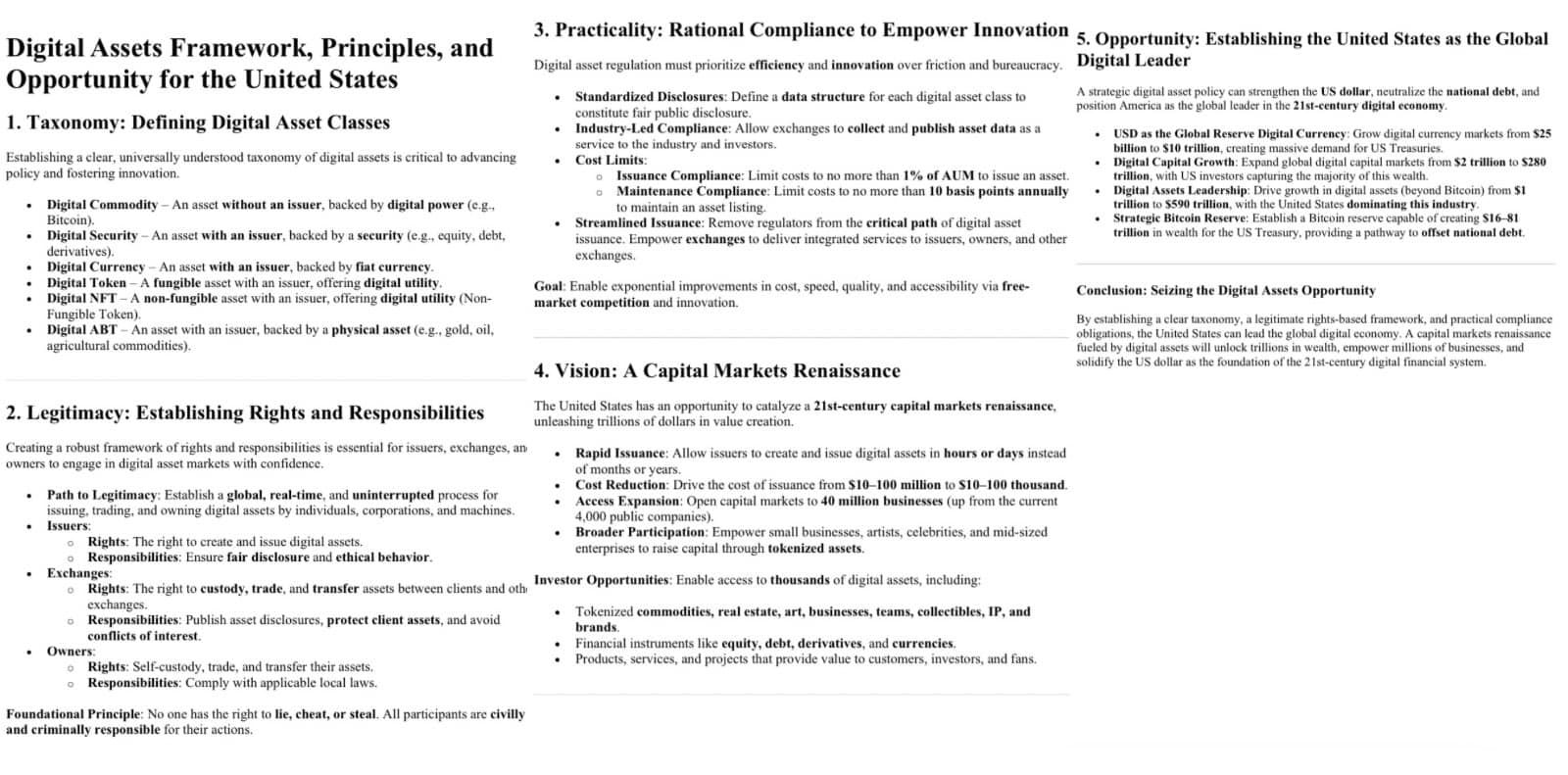 Khung pháp lý này hướng tới việc đưa Mỹ trở thành quốc gia dẫn đầu toàn cầu trong lĩnh vực tài sản số thông qua quy định minh bạch, khuyến khích đổi mới và mở rộng quy mô thị trường. Các nội dung chính bao gồm: