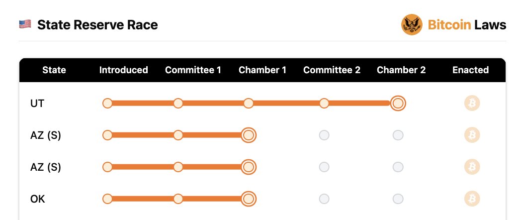 Còn các dự luật lưu trữ Bitcoin của tiểu bang Hoa Kỳ lại có tiến triển tích cực hơn. Dự luật “Bitcoin Reserve” SB 1373 đã được thông qua tại các ủy ban và hiện chuẩn bị được đưa ra bỏ phiếu tại Thượng viện. Đây là dự luật dự trữ thứ hai trong Thượng viện Arizona sẵn sàng cho một cuộc bỏ phiếu toàn diện, cùng với SB 1025. Hiện giờ, Utah là tiểu bang dẫn đầu.