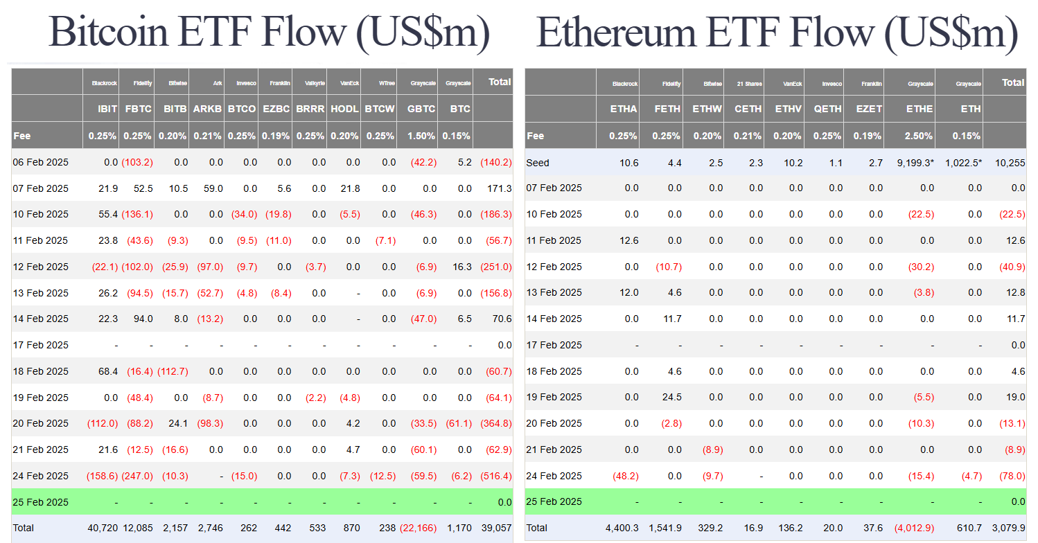 Các quỹ ETF giao ngay của BTC và ETH ở Hoa Kỳ cũng chứng kiến lực bán đáng kể. Tổng dòng tiền rời khởi BTC spot ETF trong thứ hai (24/02) là 516 triệu USD, trong đó có cả dòng tiền rời khỏi quỹ IBIT của BlackRock. ETH spot ETF cũng có dòng tiền ra là 78 triệu USD.