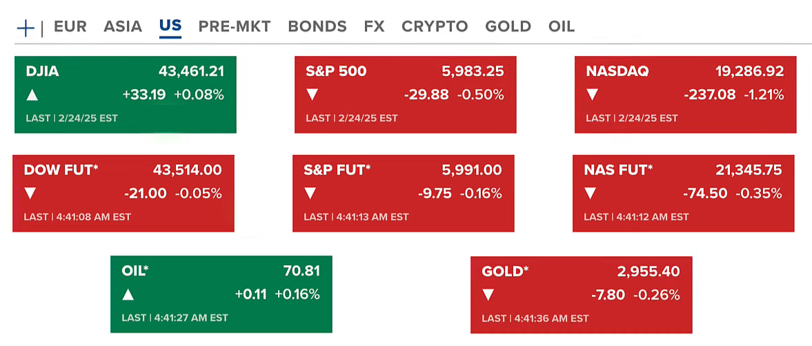 Thứ hai tại Hoa Kỳ (24/02-US), thị trường chứng khoán đóng cửa với Dow Jones gần như đi ngang, còn S&P 500 và Nasdaq đều giảm. Hợp đồng tương lai của chứng khoán cùng xu hướng giảm. Hợp đồng vàng giảm nhưng vẫn ở mức cao 2955 USD/ounce. Dầu quanh 70.8 USD/thùng.