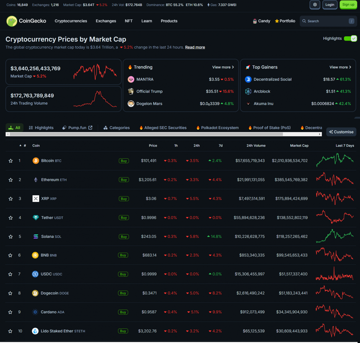 Bitcoin ngày qua đã giảm về quanh 101,000 USD. Hầu hết altcoin lớn điều chỉnh. Vốn hóa thị trường crypto cũng giảm về 3.64 nghìn tỷ USD.