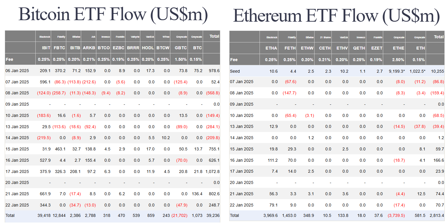 Các quỹ BTC spot ETF Hoa Kỳ phiên giao dịch thứ tư (22/01-US) đã tiếp tục có dòng tiền vào dương 248 triệu USD, chủ yếu đến từ IBIT của BlackRock. Tương tự, ETH spot ETF cũng đã có dòng tiền vào dương hơn 70 triệu USD.