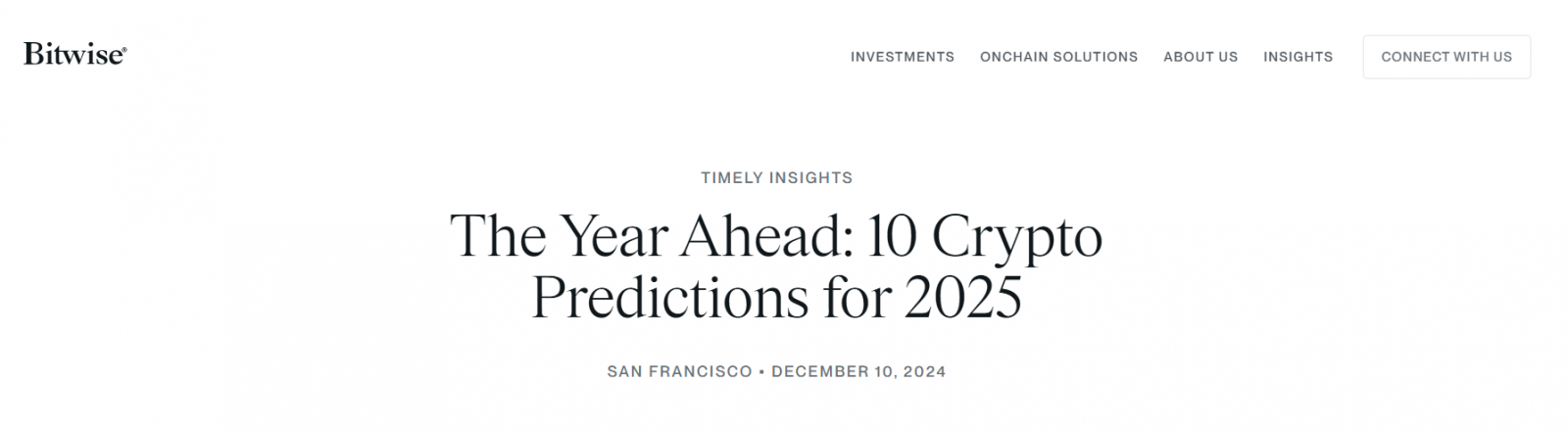 Dưới đây là 10 dự đoán táo bạo của Bitwise Về Crypto Năm 2025 và Tương Lai: