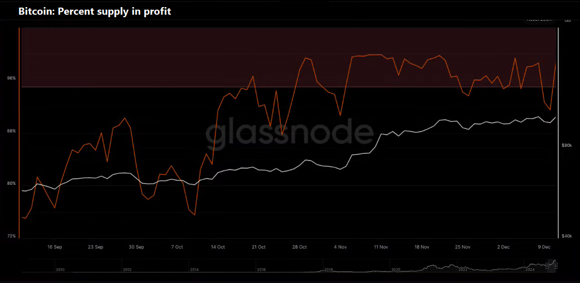 Tỷ lệ BTC có lời cũng tăng lên 98.76%. Mức trên 100,000 USD là mức cao và rất ít thời gian BTC ở mức này.