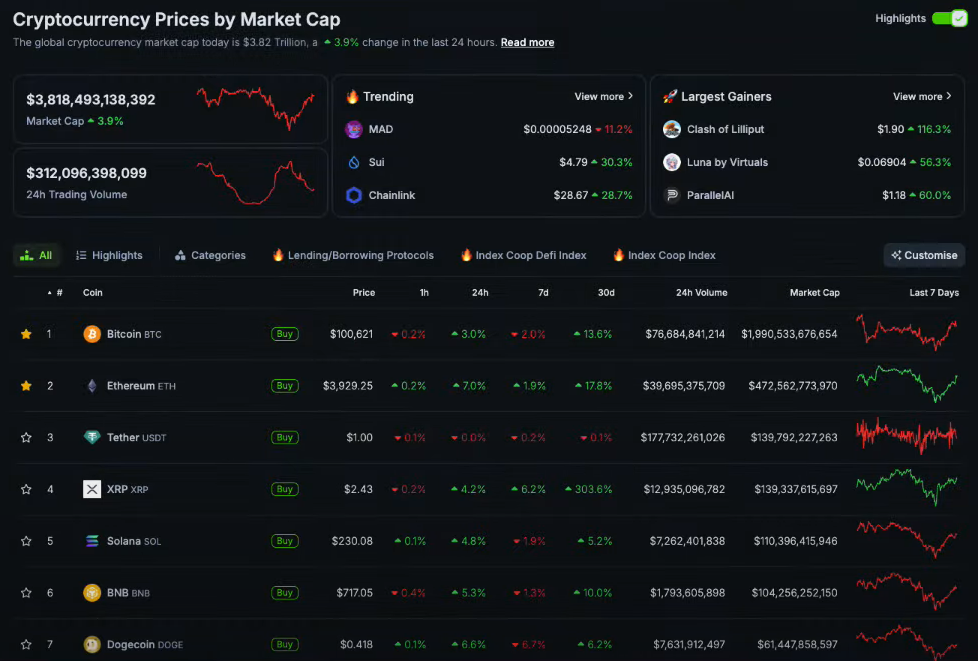 Ngày qua, BTC đã tăng trở lại trở về trên 100,000 USD. Nhiều altcoin lớn tăng trưởng. Vốn hóa thị trường crypto cũng đã tăng lên mức 3.8 nghìn tỷ USD.