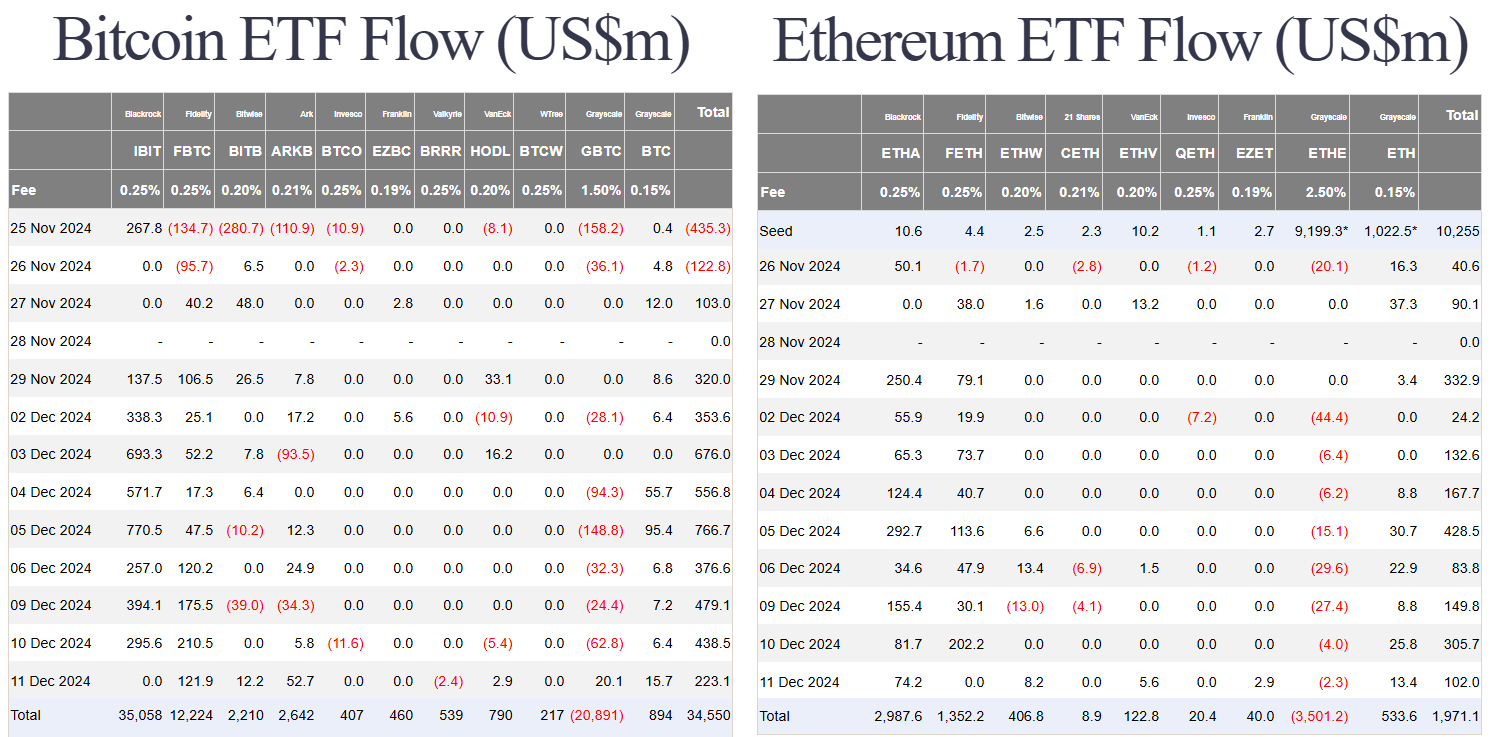 Các quỹ BTC spot ETF Hoa Kỳ thứ tư (11/12) tiếp tục có dòng tiền vào dương 223 triệu USD. Các quỹ ETH ETF cũng có dòng tiền vào 102 triệu USD. Gầy đây, BTC ETF vẫn thu hút dòng tiền vào lớn và ETH ETF cũng đã sôi động hơn với dòng tiền vào tốt.