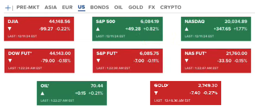Thứ tư (11/12) là một ngày tốt cho các thị trường trong đó có cả chứng khoán Hoa Kỳ. Cả ba chỉ số chứng khoán kết thúc phiên đều tăng, riêng Nasdaq đã đạt đỉnh mới. Hợp đồng tương lai của chứng khoán giảm nhẹ. Giá vàng điều chỉnh quanh 2749 USD/ounce. Dầu tăng lên 70.44 USD/thùng.