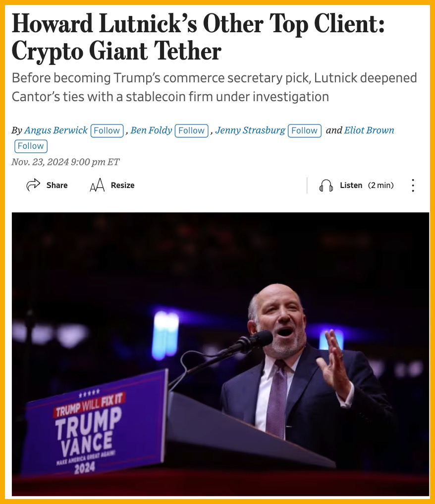 Giám đốc điều hành của Cantor Fitzgerald, Howard Lutnick, người được Tổng thống Trump đề cử làm Bộ trưởng Thương mại Hoa Kỳ, muốn hợp tác với Tether để triển khai một dự án trị giá 2 tỷ USD nhằm cho vay USD đối với khách hàng dựa trên Bitcoin. Chương trình đề xuất này được kỳ vọng sẽ mở rộng quy mô lên đến hàng chục tỷ USD.