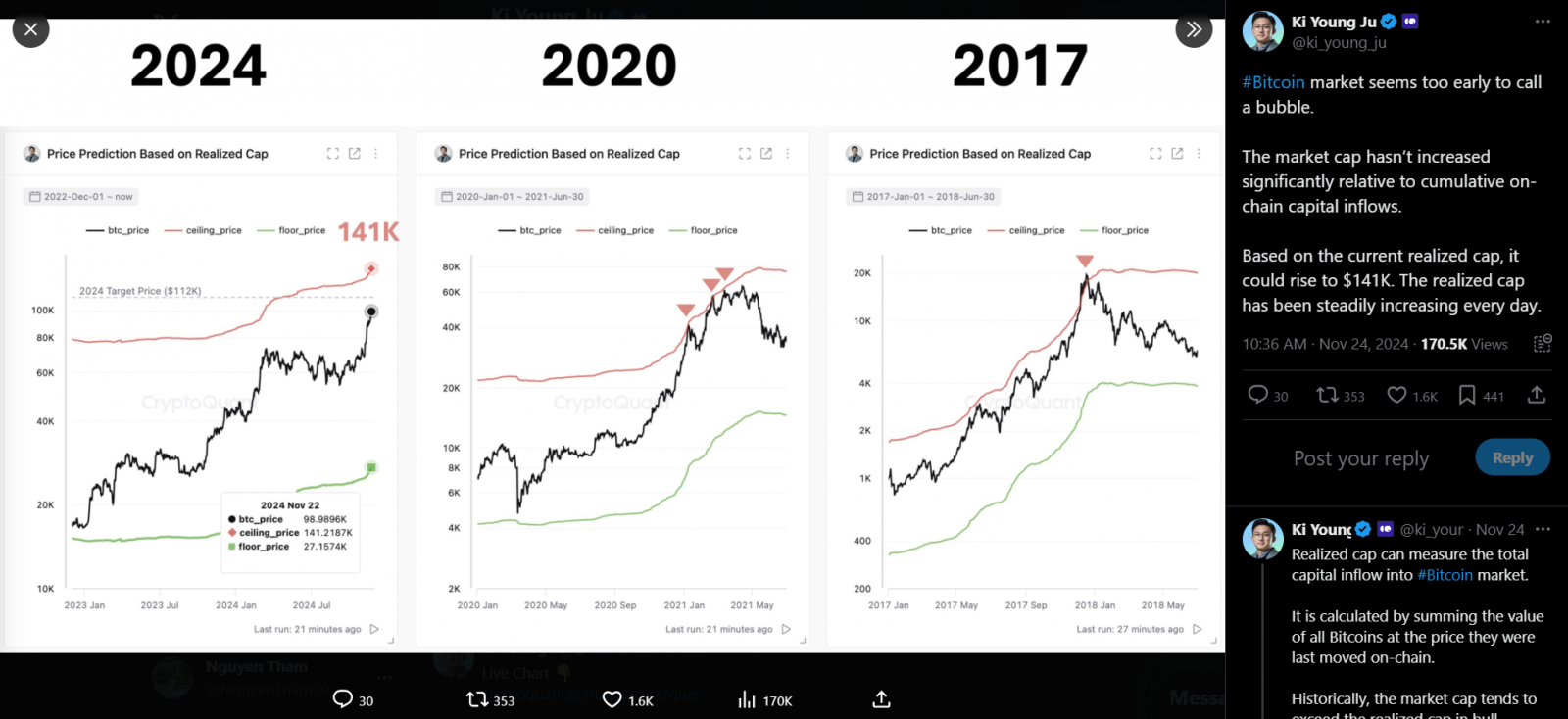 Ki Young Ju nói rằng, vốn hóa thị trường chưa tăng đáng kể so với dòng vốn tích lũy trên on-chain. Dựa trên mức vốn hóa thực tế hiện tại, BTC có thể tăng lên 141,000 USD. Mức vốn hóa thực tế đã tăng đều đặn mỗi ngày.