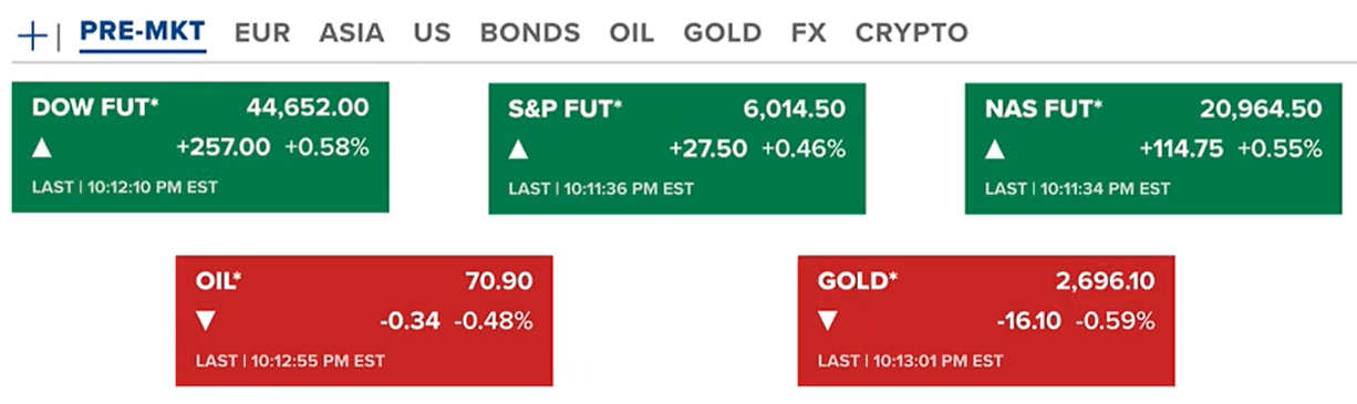 Thị trường hợp đồng tương hứng khoán Hoa Kỳ chủ nhật (24/11) tăng ở cả ba chỉ số đều trên 0.4%. Hợp đồng dầu vẫn quanh 70 USD/thùng. Vàng điều chỉnh nhẹ về 2696 USD/ounce.