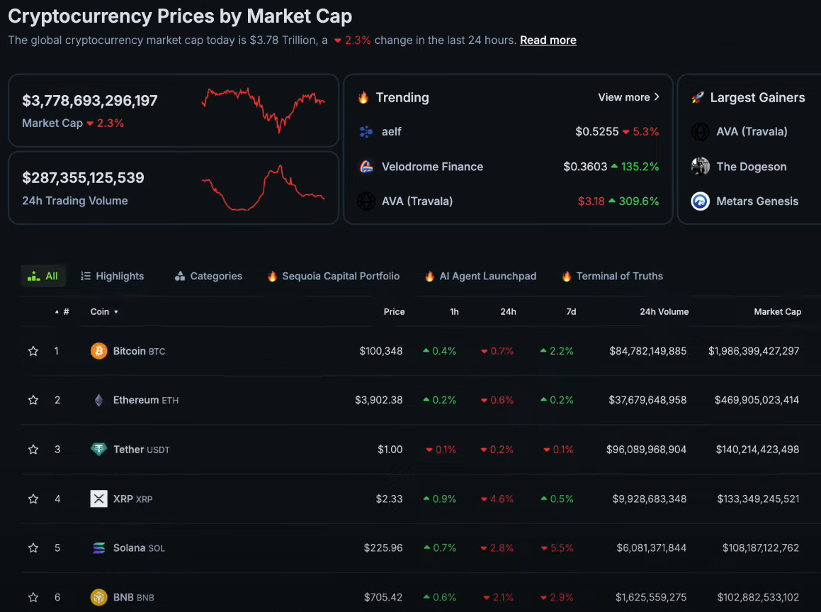 Về thị trường crypto, BTC tiếp tục xoay quanh mốc 100,000 USD. BTC đi ngang nhưng nhiều altcoin lại giảm. Vốn hóa thị trường crypto cũng giảm về 3.778 nghìn tỷ USD.