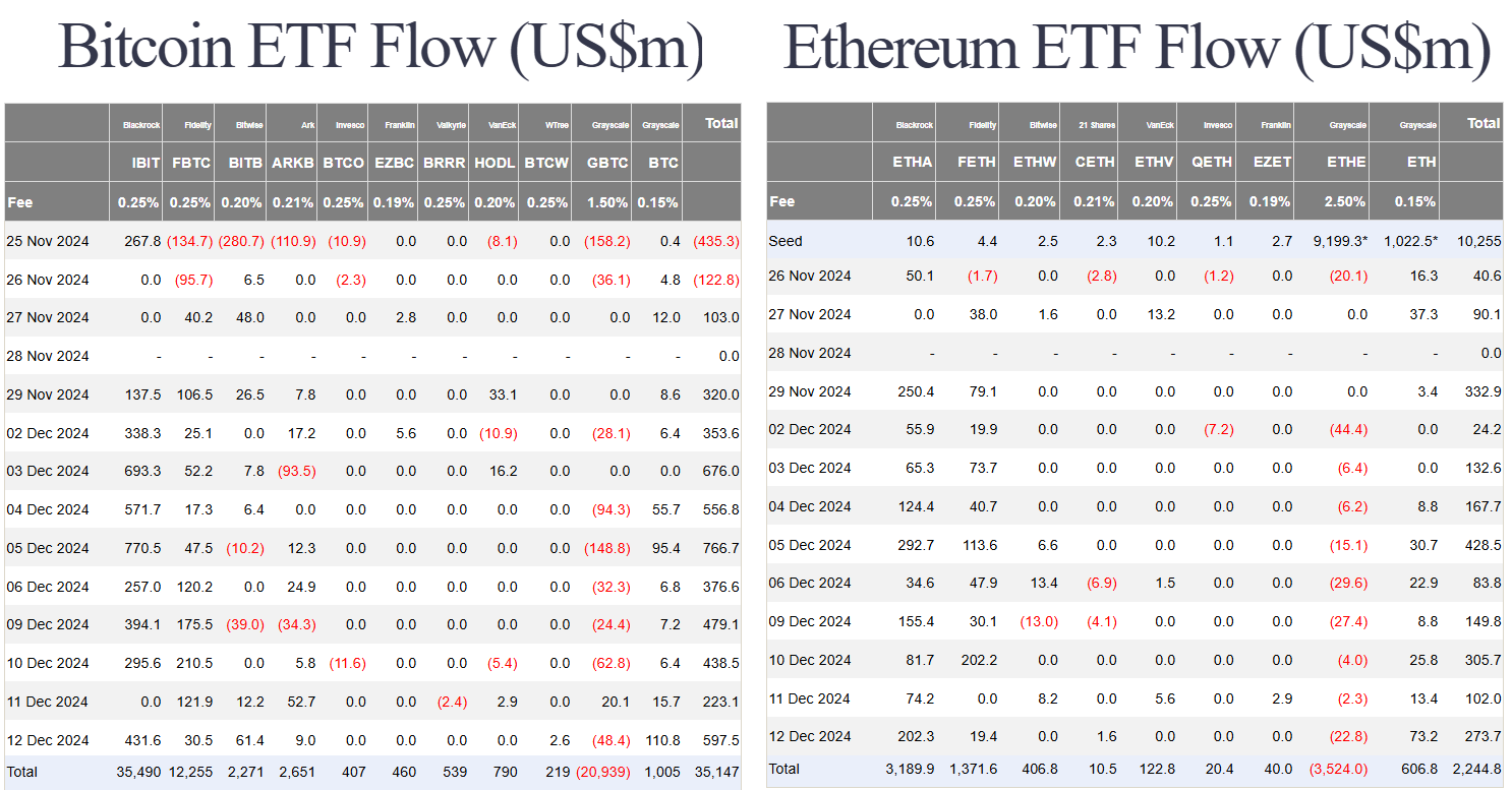Các quỹ BTC spot ETF Hoa Kỳ thứ năm (12/12) tiếp tục có dòng tiền vào tốt với tổng 597 triệu USD. Trong đó, quỹ IBIT của BlackRock có dòng tiền vào lớn nhất 431 triệu USD. Còn ETH ETF cũng có dòng tiền vào 273 triệu USD, tiếp tục là chuỗi ngày dài có dòng tiền vào lớn.