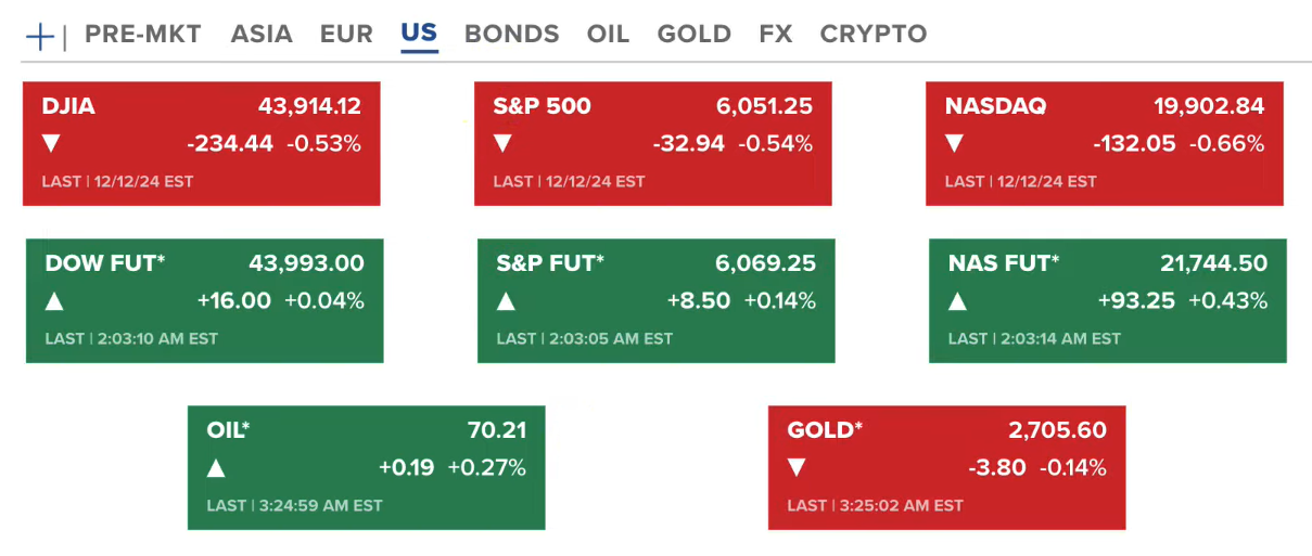 Chứng khoán Hoa Kỳ thứ năm (13/12) kết thúc phiên cả ba chỉ số đều giảm nhẹ sau nhiều phiên tăng và có những chỉ số đạt đỉnh mới. Hợp đồng tương lai của chứng khoán lại là xu hướng tăng. Giá dầu vẫn quanh 70 USD/thùng. Vàng giảm nhẹ về 2705 USD/ounce.