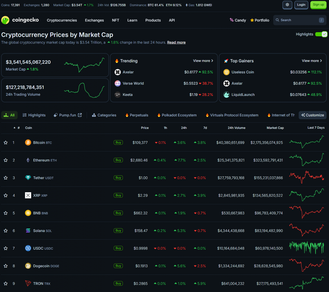Bitcoin đã tăng lên quanh 109,000 USD đến 100,000 USD. Hầu hết các altcoin lớn đều tăng và tăng nhiều hơn BTC. Vốn hóa thị trường crypto là 3.54 nghìn tỷ USD.