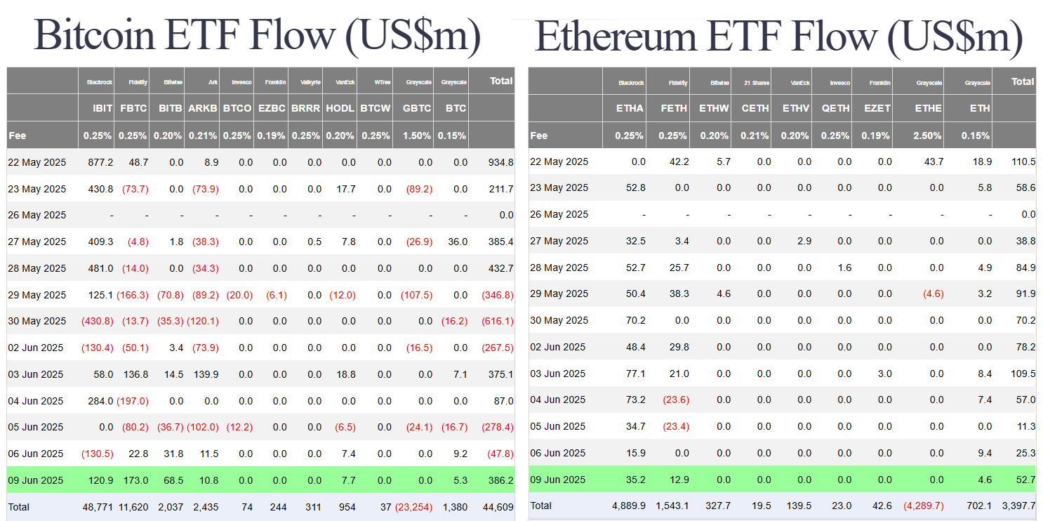 Các quỹ BTC spot ETF Hoa Kỳ ngày 09/06 đầu tuần kết thúc phiên với dòng tiền vào dương 386.2 triệu USD. ETH spot ETF cũng tiếp tục có dòng tiền vào 52.7 triệu USD.